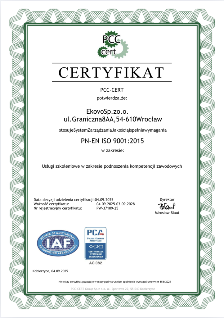 W EKOVO stawiamy na jakość, która ma realne znaczenie w codziennej współpracy z klientami i partnerami. Posiadamy certyfikat ISO 9001:2015, potwierdzający skuteczne zarządzanie procesami oraz wysokie standardy realizowanych usług. Certyfikacja obejmuje działalność szkoleniową i jest potwierdzeniem naszego profesjonalnego podejścia, dbałości o szczegóły oraz ciągłego doskonalenia. Dla klientów EKOVO to pewność sprawnej realizacji, rzetelnej obsługi i rozwiązań tworzonych w oparciu o sprawdzone standardy jakości.